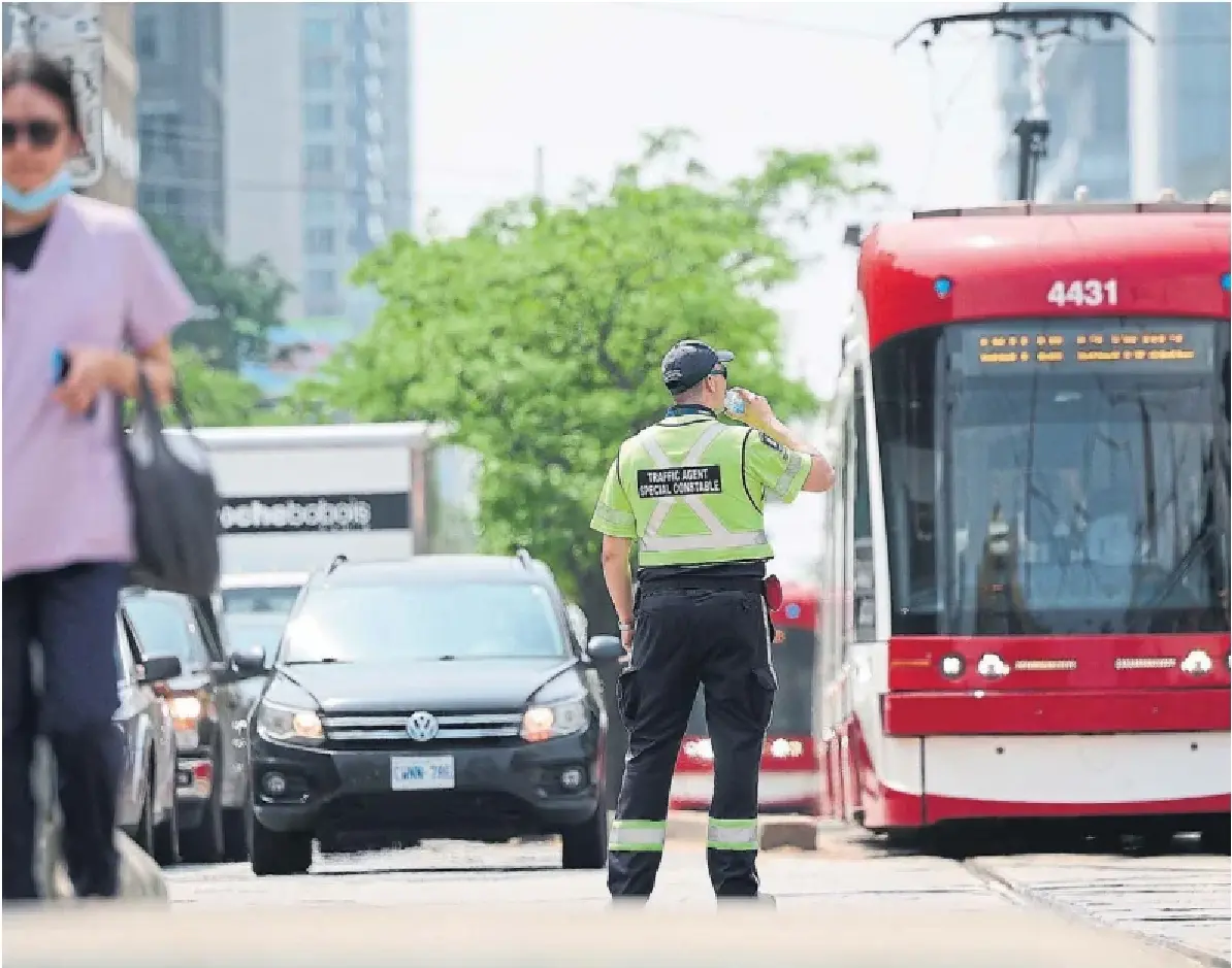 A transit officer stays hydrated at the corner of Queen and Spadina as high heat and humidity is set to descend on the city.