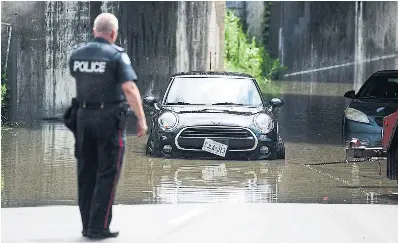 An officer looks on as vehicles sit in water at Parkside and Lake Shore after heavy rain caused flooding in the area on July 16.