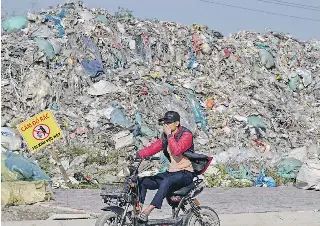 A man rides a motorbike past a pile of plastic waste in Vietnam’s Hung Yen province, in November, 2025. More than 450 million tonnes of plastics are manufactured each year.