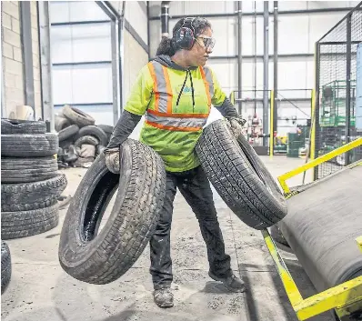 A worker loads tires at the Environmental 360 Solutions tire recycling plant in Barrie, Ont. The company helps manufacturers, brands, importers and retailers fulfil recycling requirements.